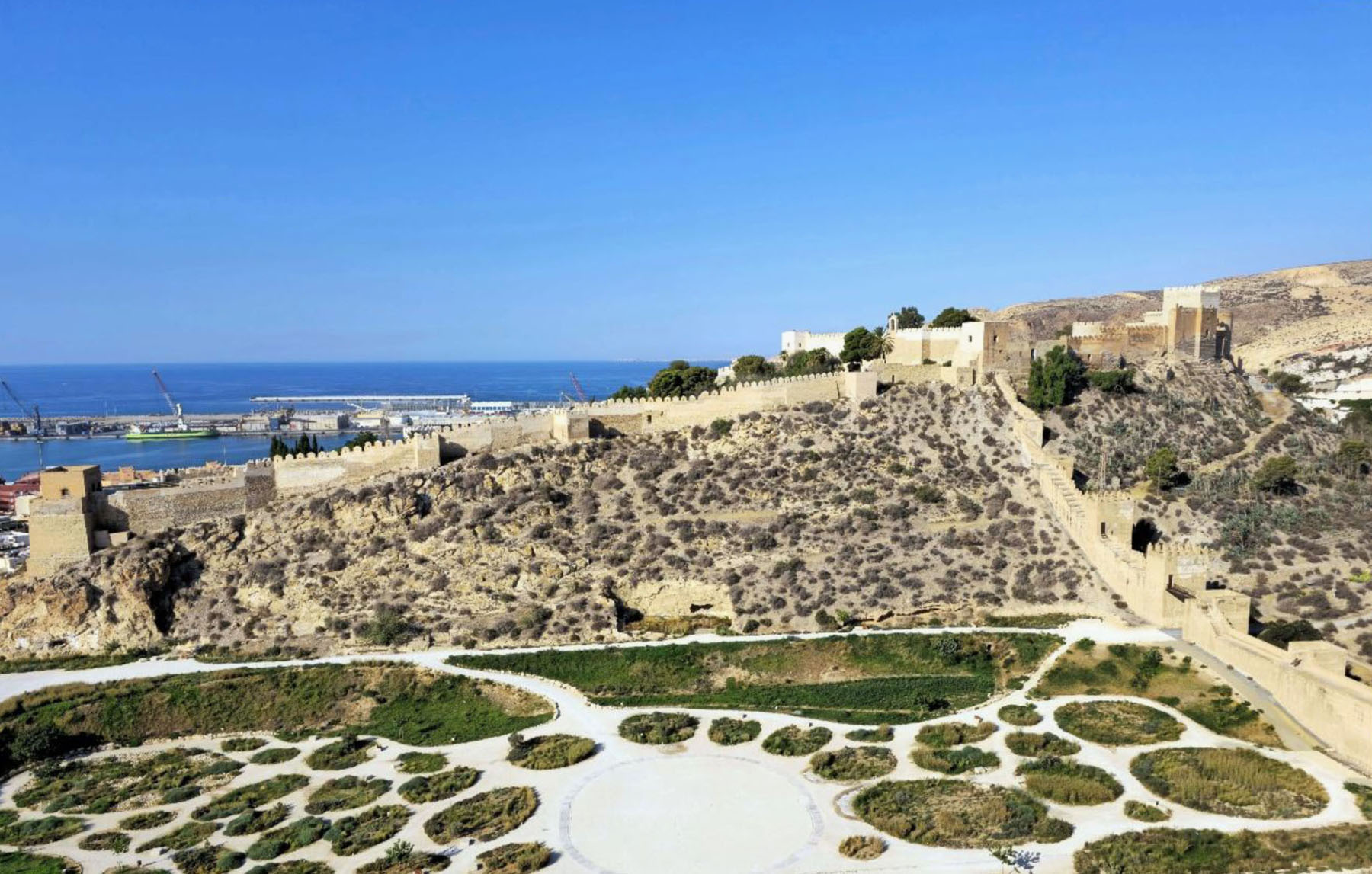 El texto subraya la importancia del puerto de Almería, creado en el siglo IX y conquistado por los Reyes Católicos en el siglo XV, como motor comercial y punto estratégico para la expansión en el Mediterráneo y el norte de África. Se dedica especial atención al análisis de la Alcazaba, las murallas urbanas musulmanas y los barrios intramuros, estudiando sus diseños, materiales y relación con las canteras de mármol de Macael, así como las pérdidas patrimoniales por demoliciones y terremotos.