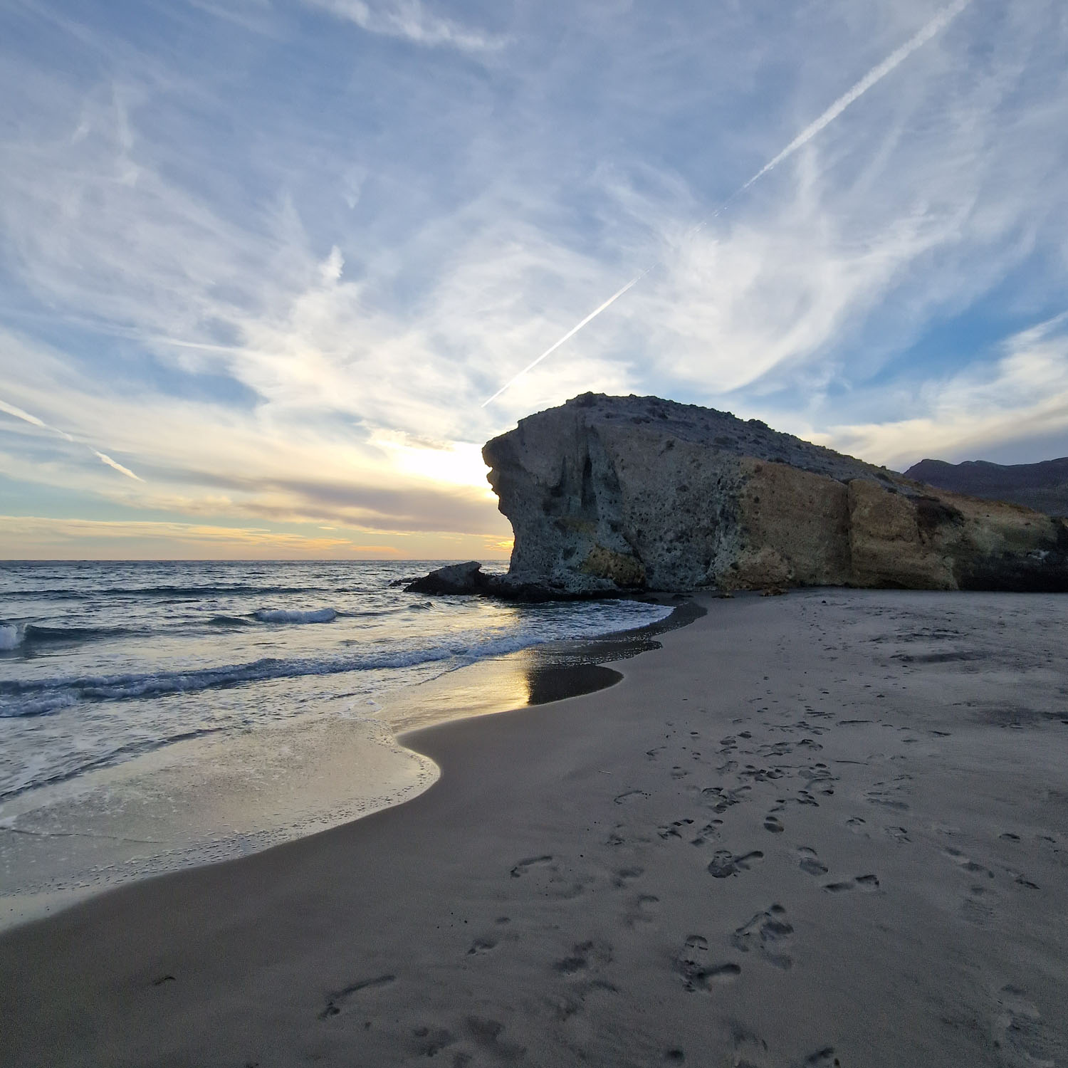 Por esta razón, el poema ensalza la belleza de la playa de Mónsul, al tiempo que admira la magia, el misterio del entorno nombrado como «vuelo». Una palabra frecuente en el poemario (selección) Ser en luz (2017), que nos remite a la poesía andalusí y también al espiritualismo renacentista. La ola pétrea, en su vuelo, simboliza el ser de fuego que aspira al encuentro con la luz «por el aire».