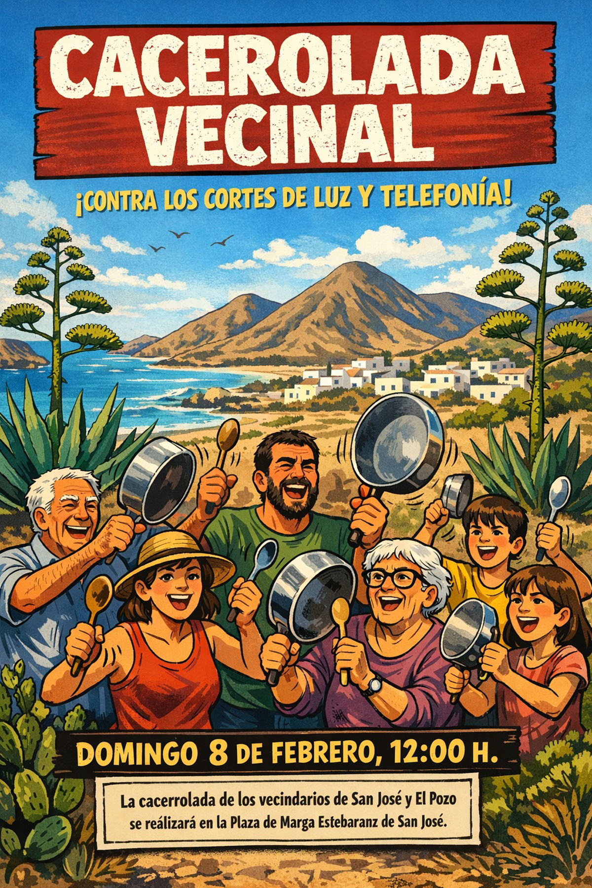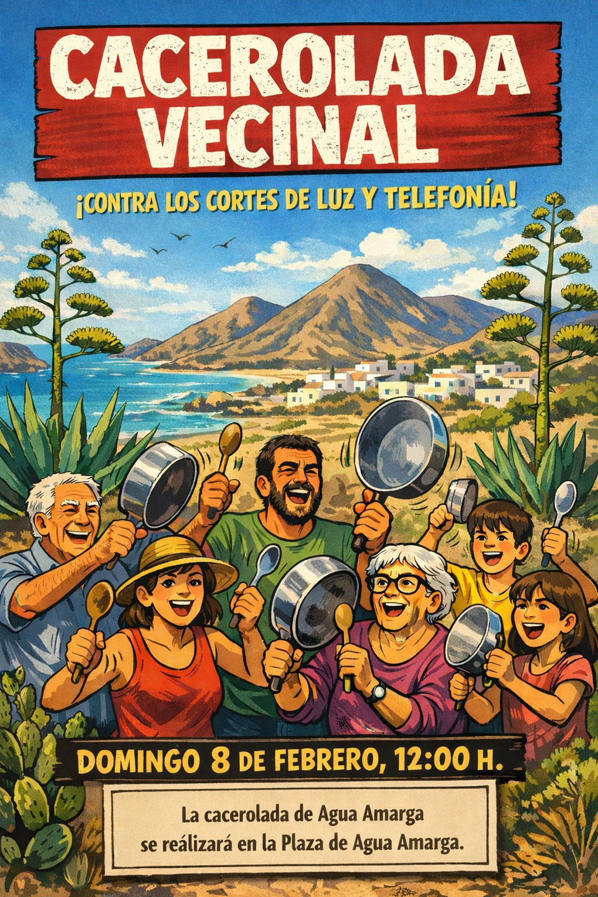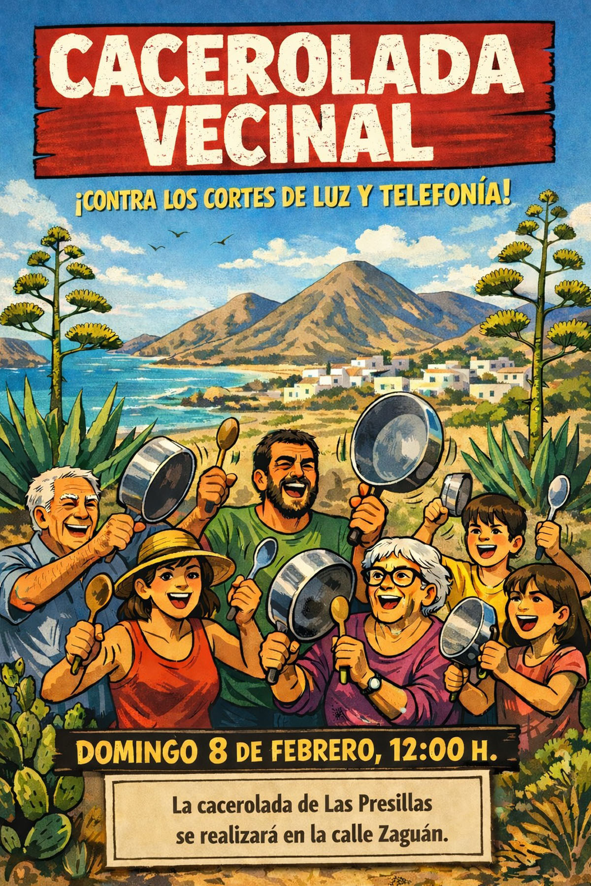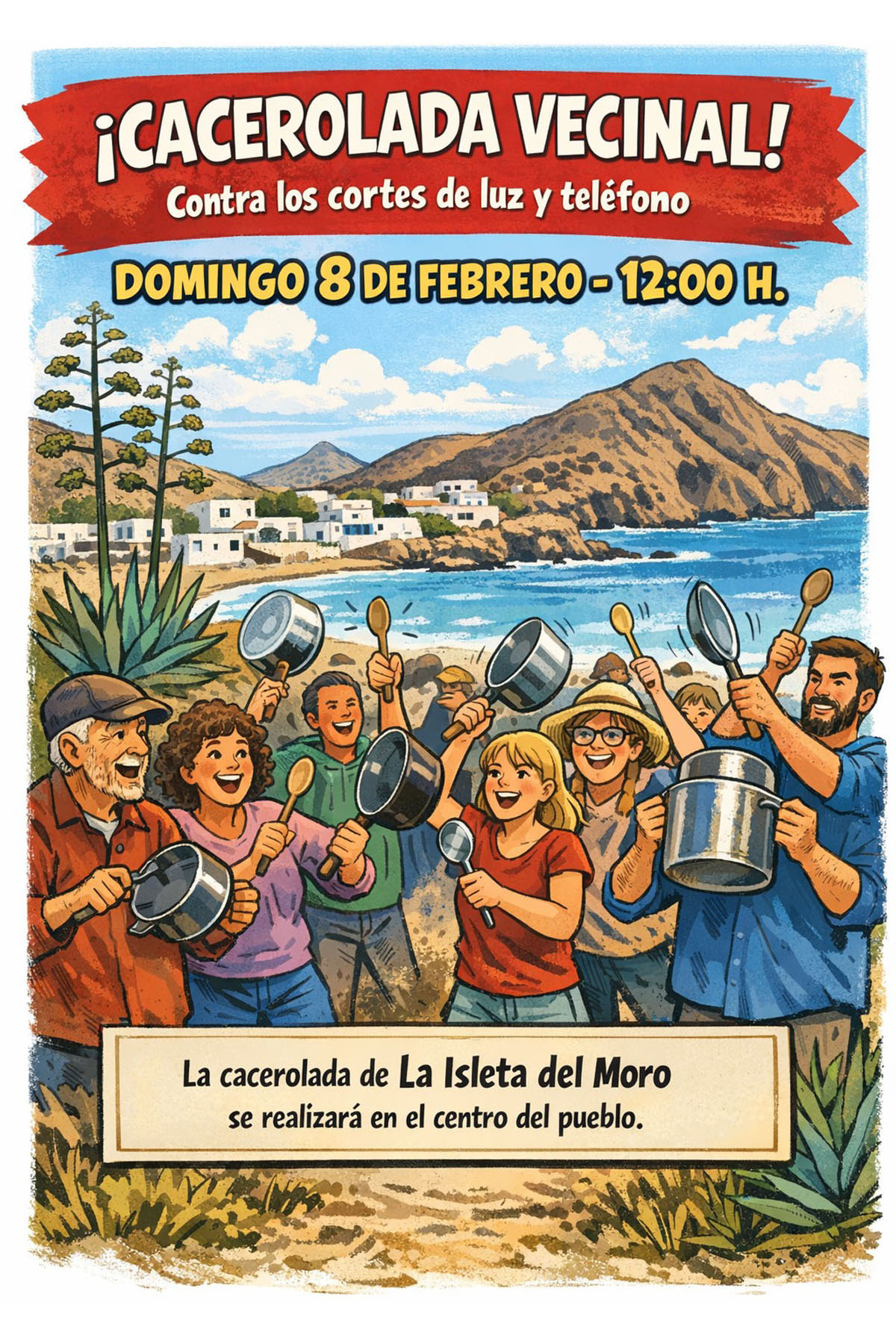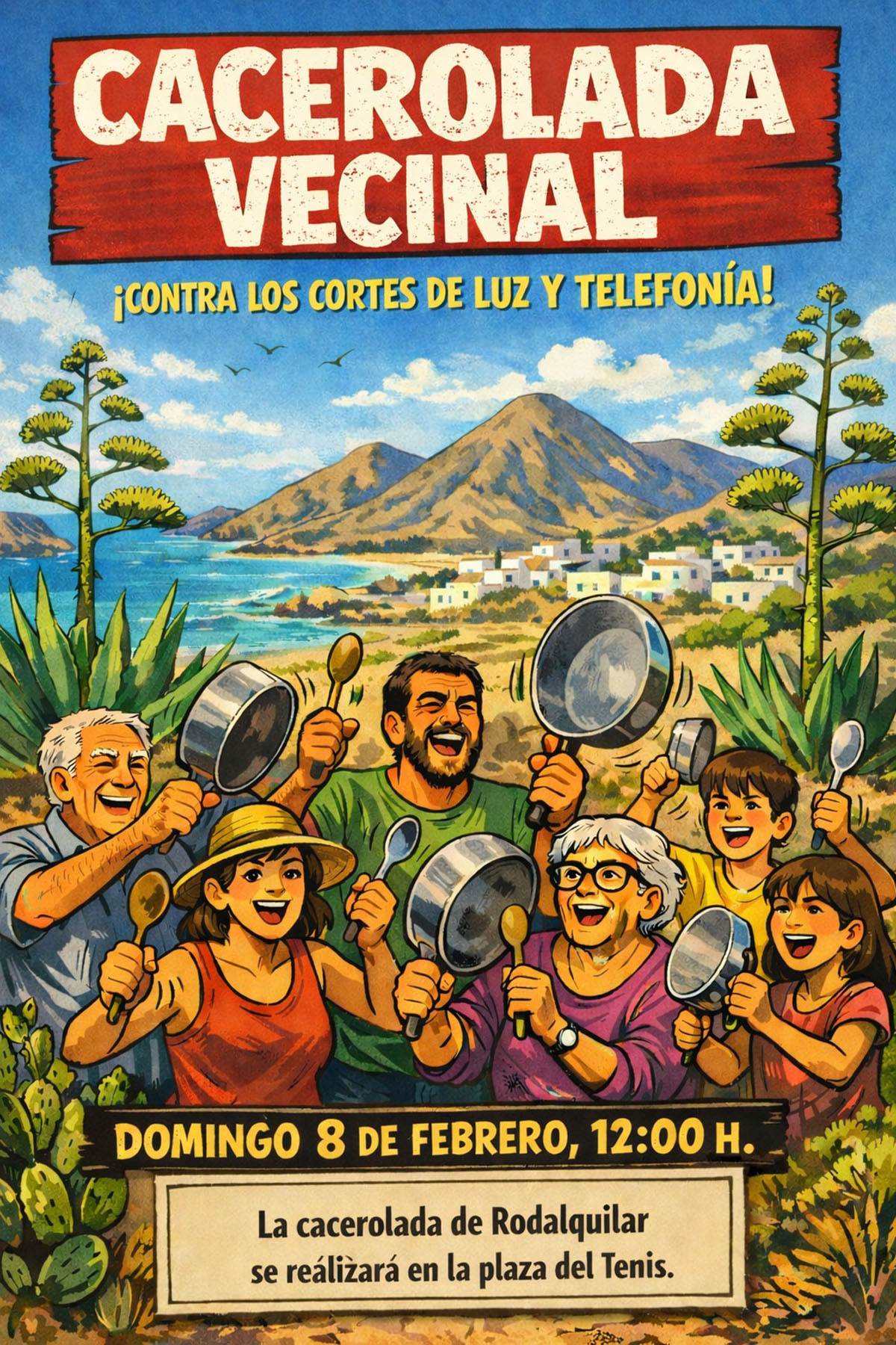 La Coordinadora de los Pueblos del Cabo de Gata ha convocado una cacerolada vecinal el 8 de febrero a las 12h para expresar públicamente su malestar ante los reiterados cortes de suministro eléctrico y las graves deficiencias en la telefonía, una situación que afecta de forma directa a la vida cotidiana y a la seguridad en estos núcleos del Parque Natural.