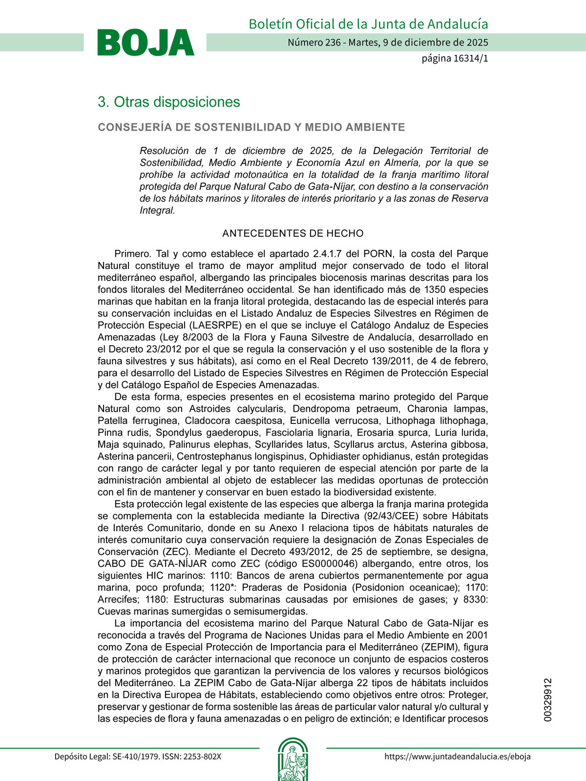 La resolución, dictada por la Delegación Territorial de Sostenibilidad, Medio Ambiente y Economía Azul en Almería y publicada en el BOJA, establece que las motos de agua no podrán circular en ningún punto del litoral protegido del Parque, durante todo el año, con el objetivo de preservar los hábitats marinos y litorales de interés prioritario y las zonas de Reserva Integral .