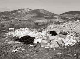 Varias toneladas de residuos de la construcción, bidones de metal, otros de plástico, botellas de polietileno, otras de cristal, cajas de cartón han sido vertidos en los bordes del camino. Unos cientos de metros más adelante, varias decenas de metros cuadrados de plásticos para invernaderos han sido arrojados en el campo y luego parcialmente dispersados por el viento.